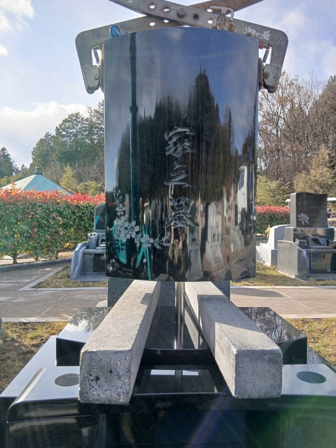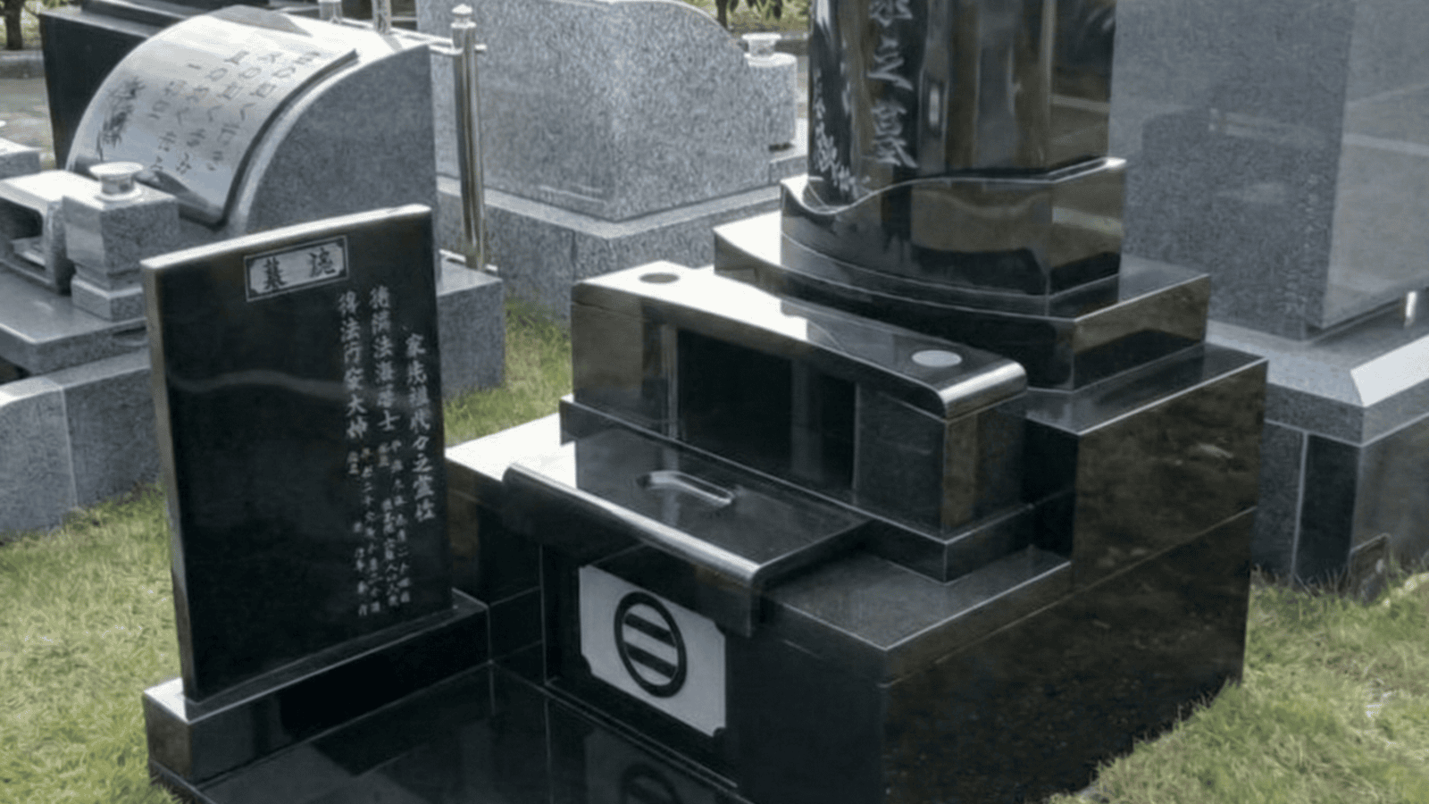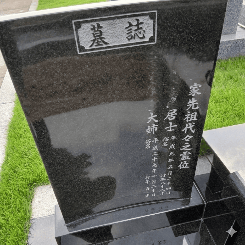 【お墓施工事例】宇都宮市の霊苑| 黒御影石の墓誌付き芝墓地