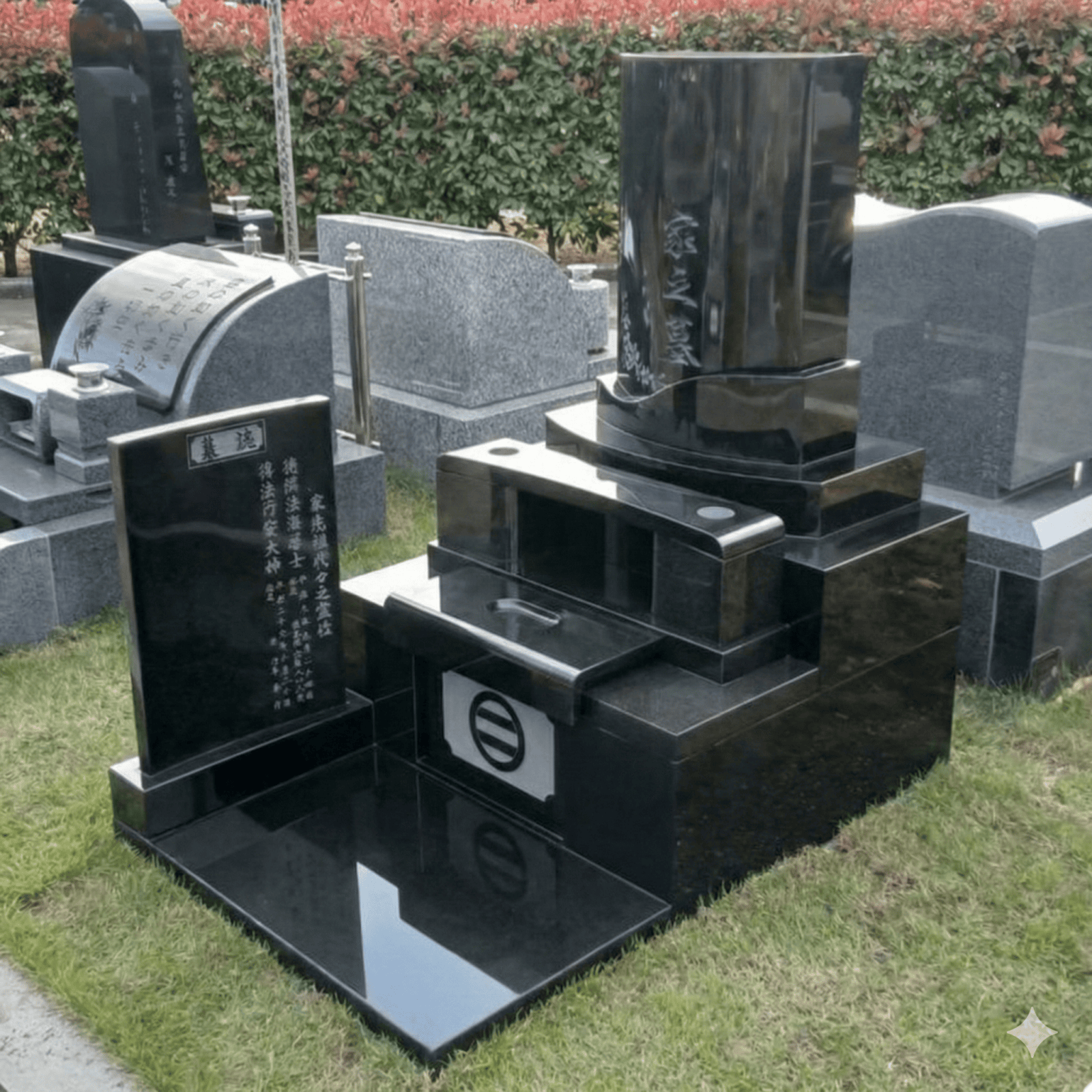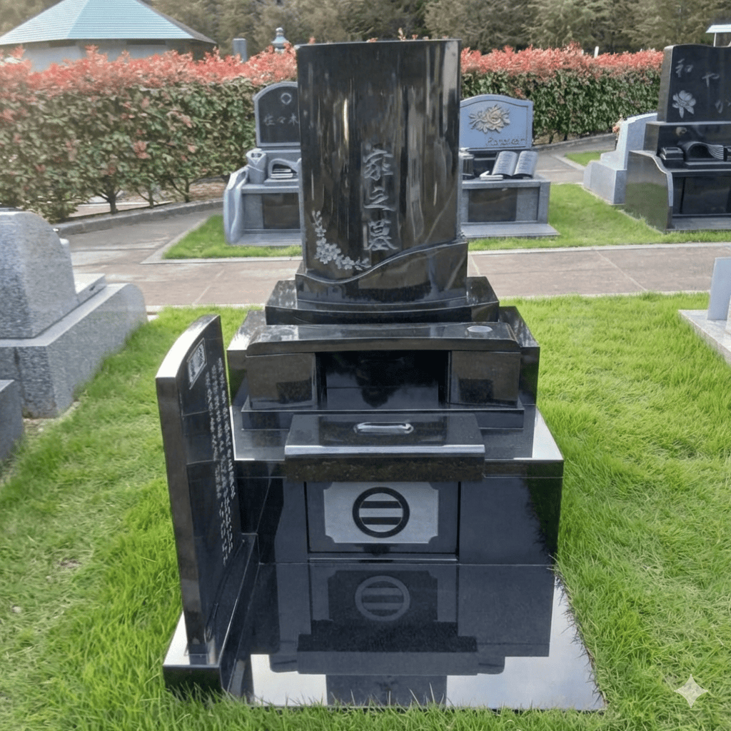 すべてインドの黒御影石を使用した和洋風の縦長の墓誌付き芝墓地です。