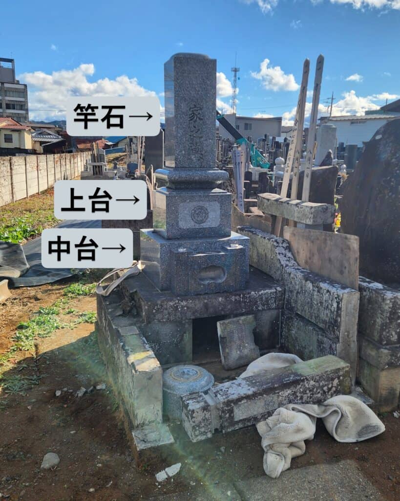 石塔は小型ショベルで一番上の竿石と上台まではなんとか外せましたが、中台は重くて(概算で390kg程度)ショベルでは吊ることが困難です。