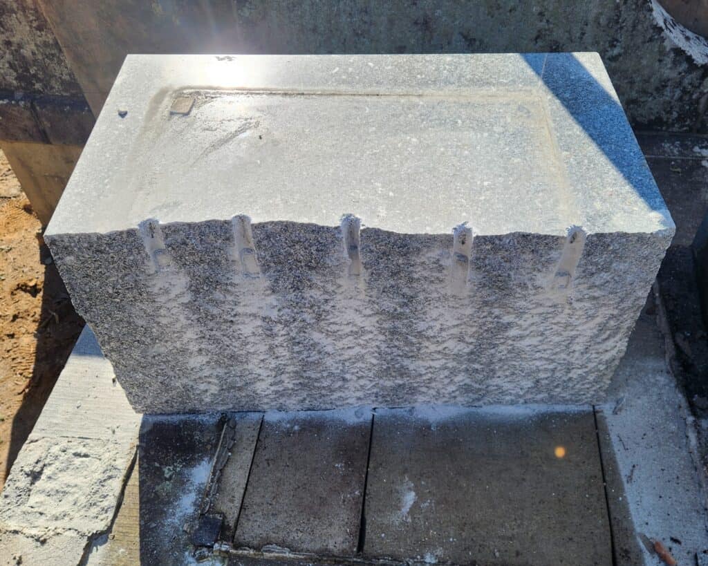 そして空けた穴に「セリ矢」と呼ばれる石に内部から圧力をかけて割るための道具をセットしてハンマーで思い切り叩いていくと、、、