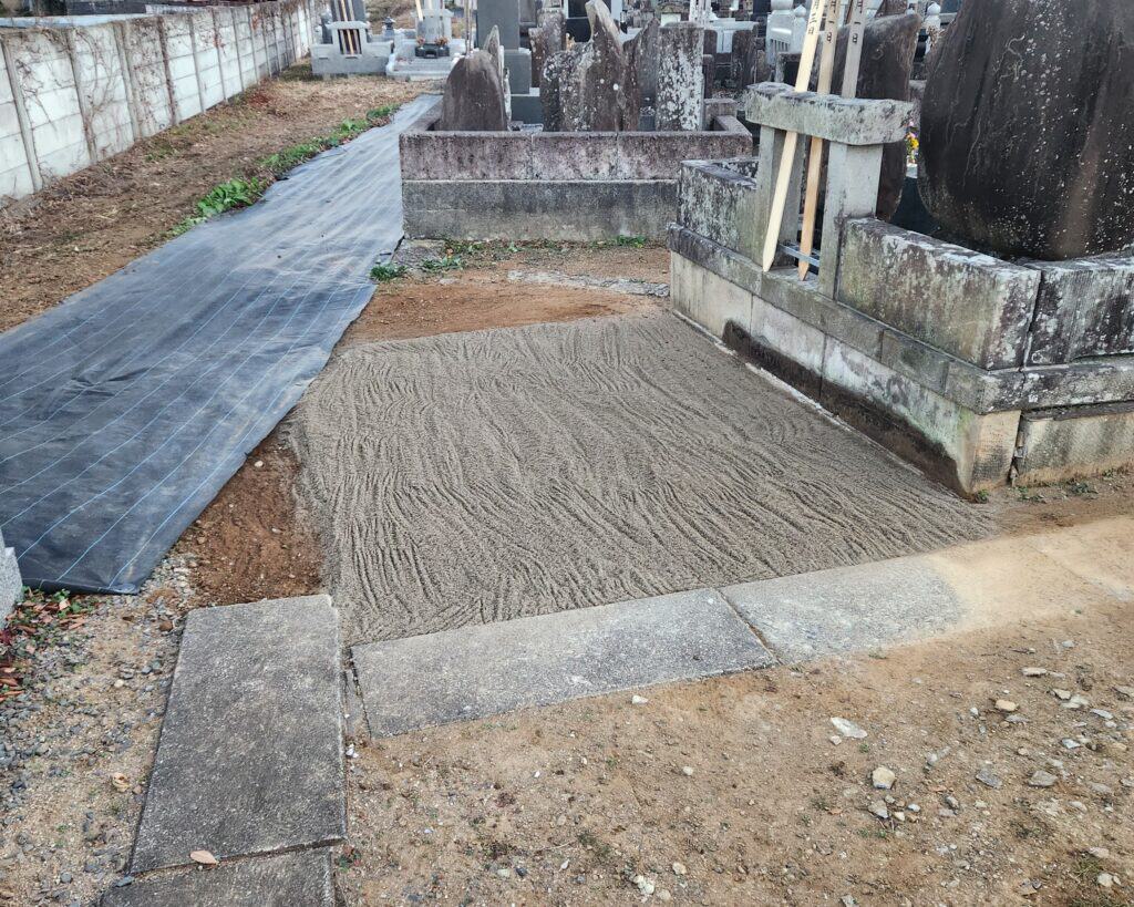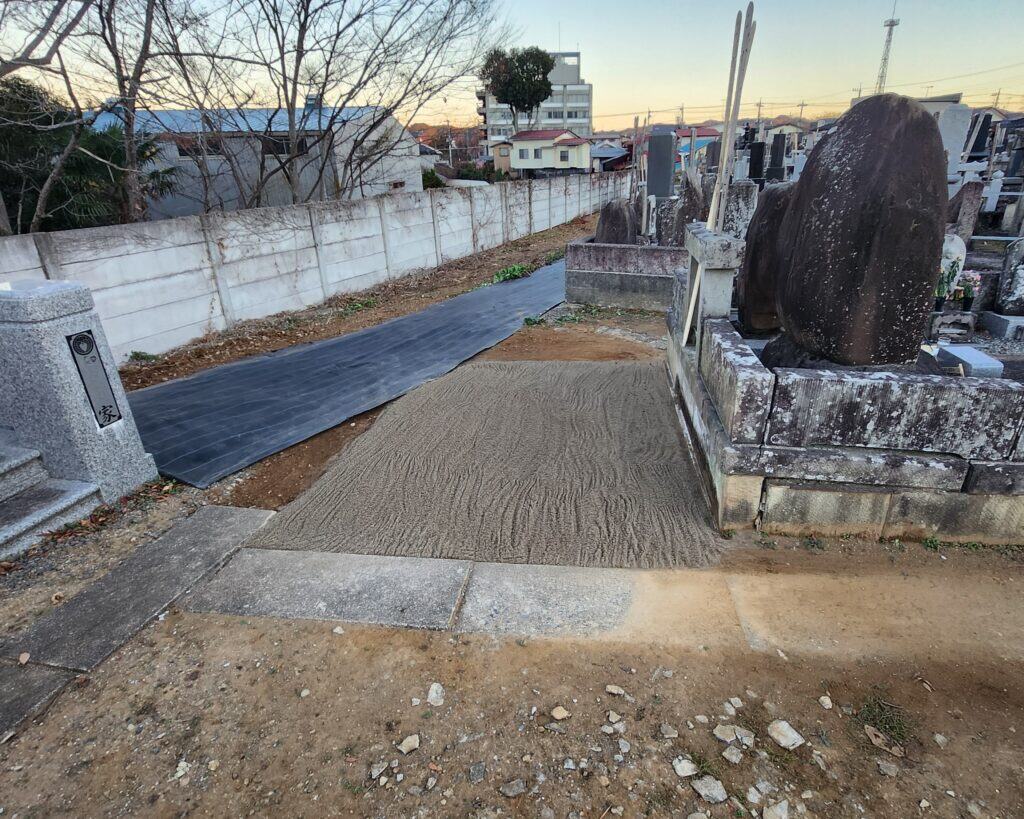一番上には川砂を敷いて、防草シート等も元の通りに戻し、砂埃などで汚してしまった周辺の掃除を念入りにして墓じまい完成です。